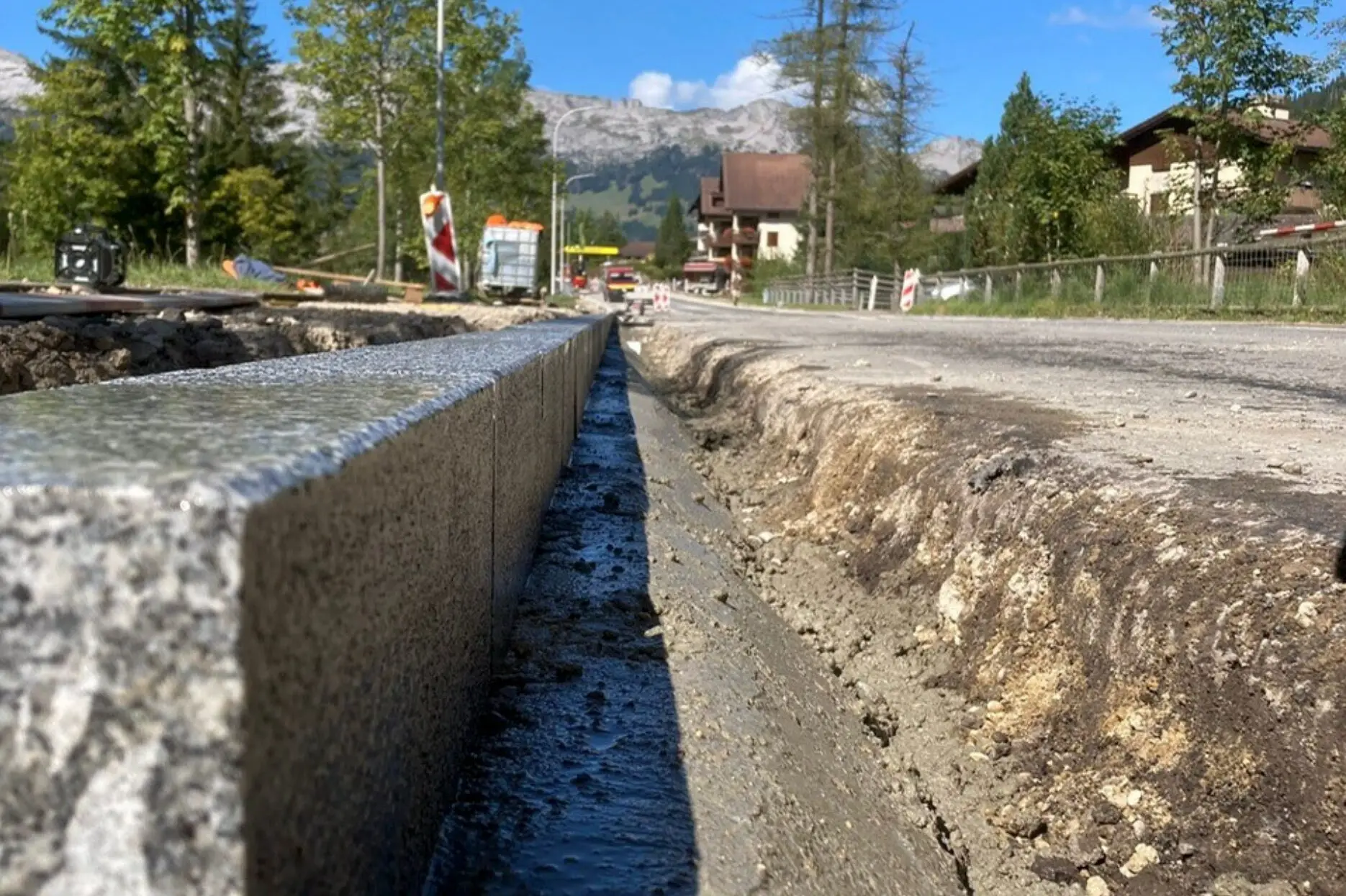 Diese Strassensanierung umfasste den Ersatz von rund 20’000 m‘ Belag inklusive Trag-, Binder- und Deckschicht – insgesamt über 4’500 Tonnen Einbauleistung. Die Arbeiten erstreckten sich über etwa 4’500 m Strassenränder und wurden unter laufendem Verkehr präzise koordiniert. Parallel dazu realisierten wir eine neue Wasserleitung auf 600 m Länge und den Lauibachdurchlass mit rund 4 m Tiefe – sicher und termingerecht.