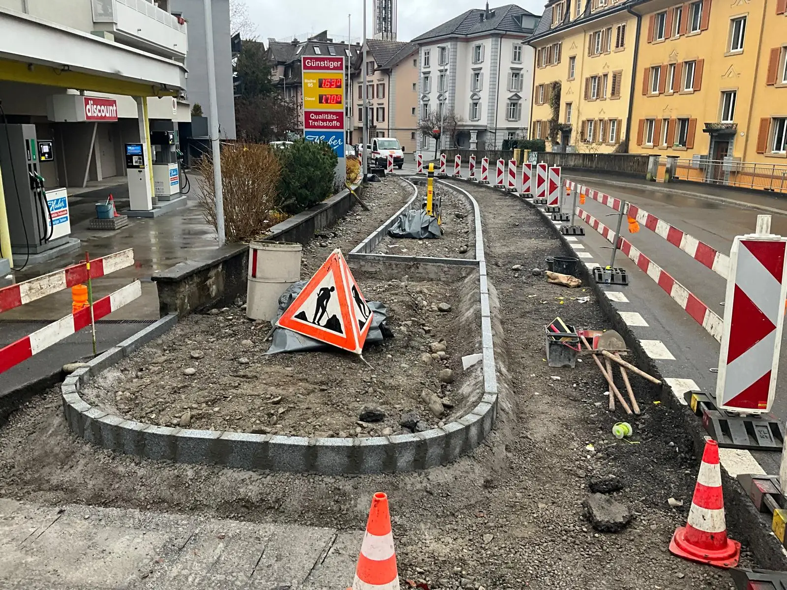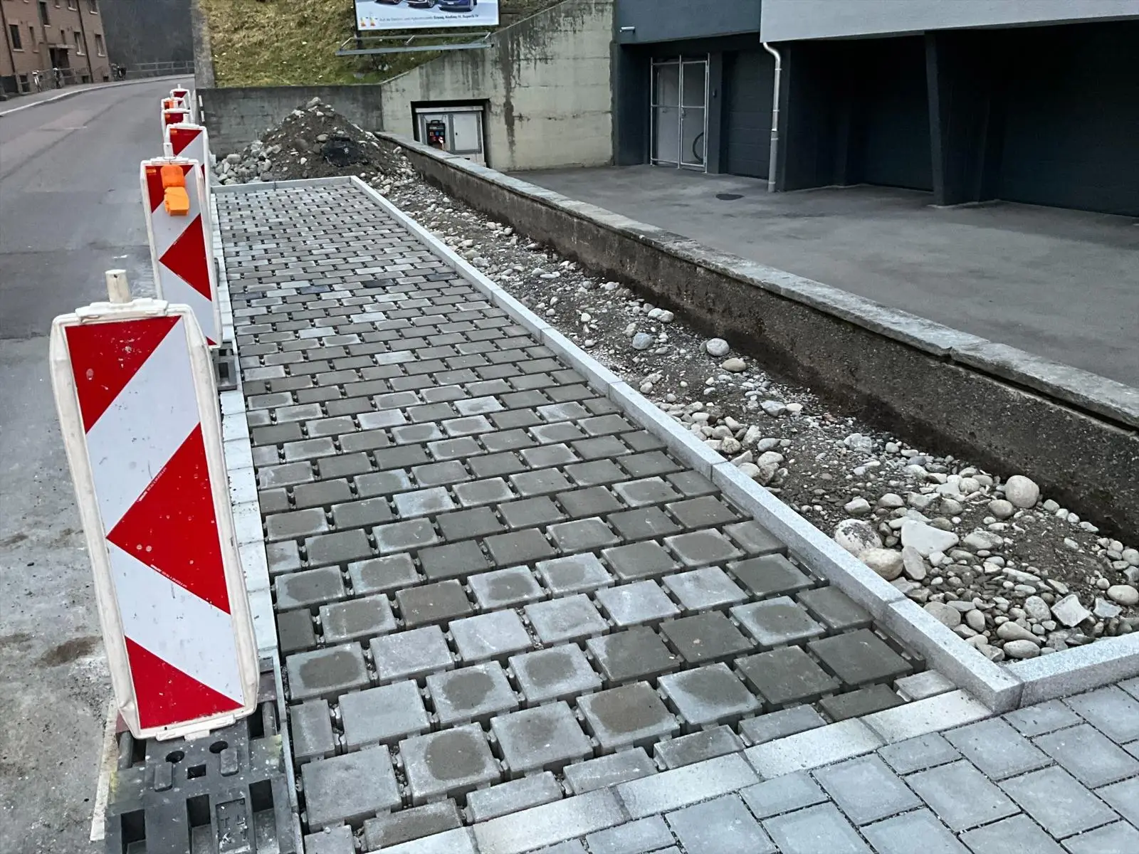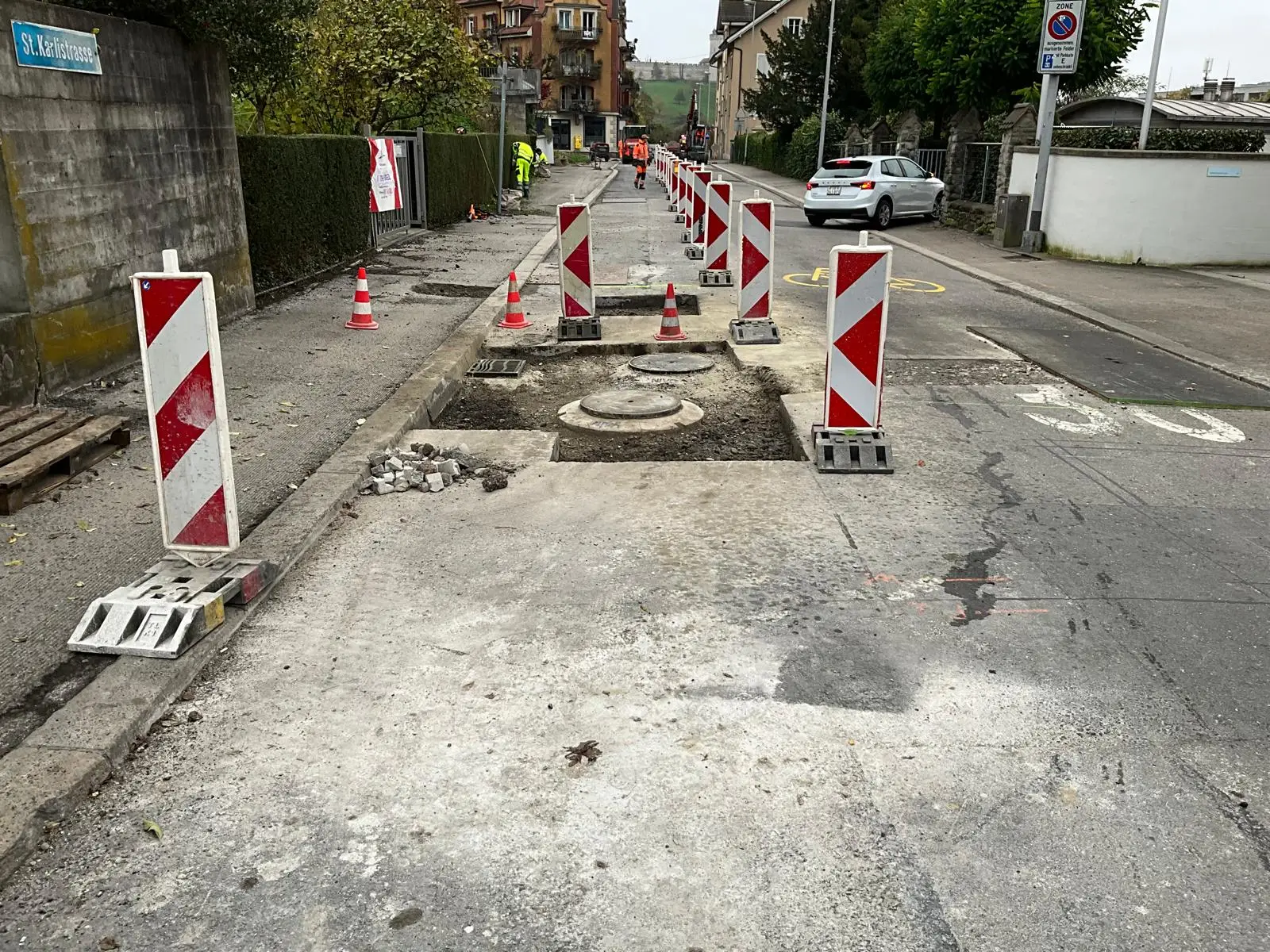 Wir haben das Gas- und Wassernetz sowie diverse Entwässerungsleitungen und Schachtabdeckungen in der St. Karlistrasse ersetzt. Zusätzlich entsiegelten wir Flächen und ersetzten den Asphalt durch einen Ökostein mit 3 cm breiten Fugen. So versickert Oberflächenwasser direkt vor Ort und entlastet das Leitungssystem bei Starkregen. Zum Schluss frästen wir die Deckbeläge ab und erneuerten sie.