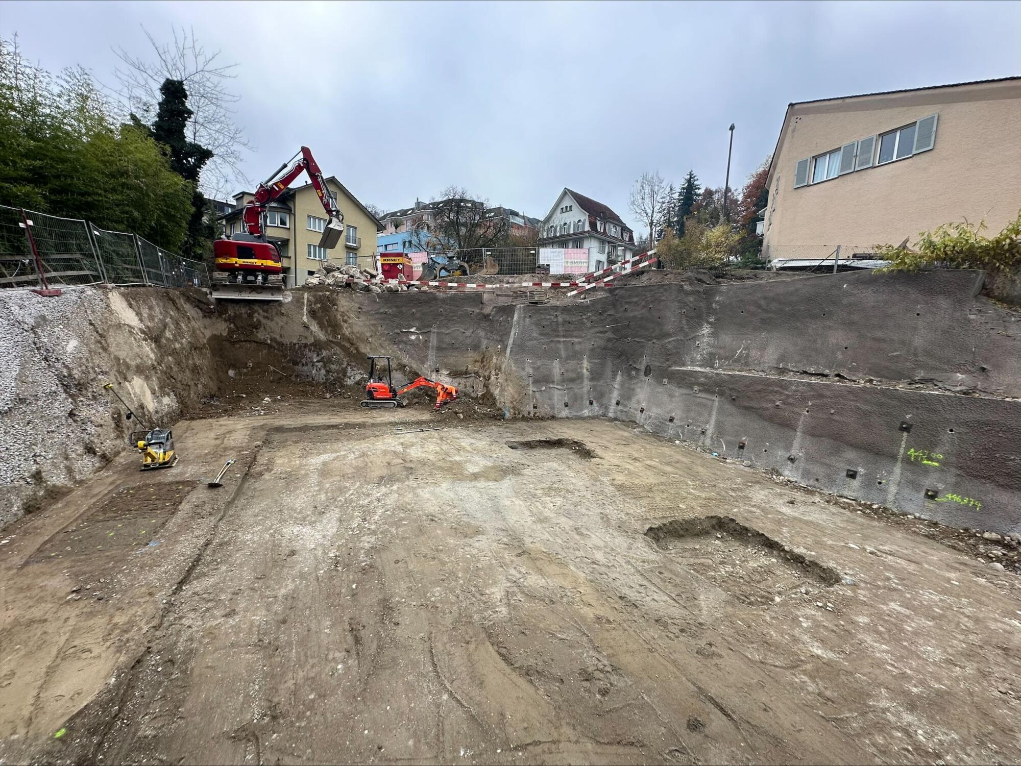 Für dieses Projekt führten wir den selektiven Abbruch der bestehenden Bausubstanz aus. Anschliessend erstellen wir den Aushub für den Neubau unter Einhaltung aller Sicherheits- und Umweltauflagen. Aufgrund der engen Platzverhältnisse wurde die Baugrube mit einer Nagelwand gesichert. Diese Bauweise ermöglichte eine wirtschaftliche und stabile Lösung für die Baugrubensicherung. Das Projekt konnte termingerecht und in hoher Qualität abgeschlossen werden.