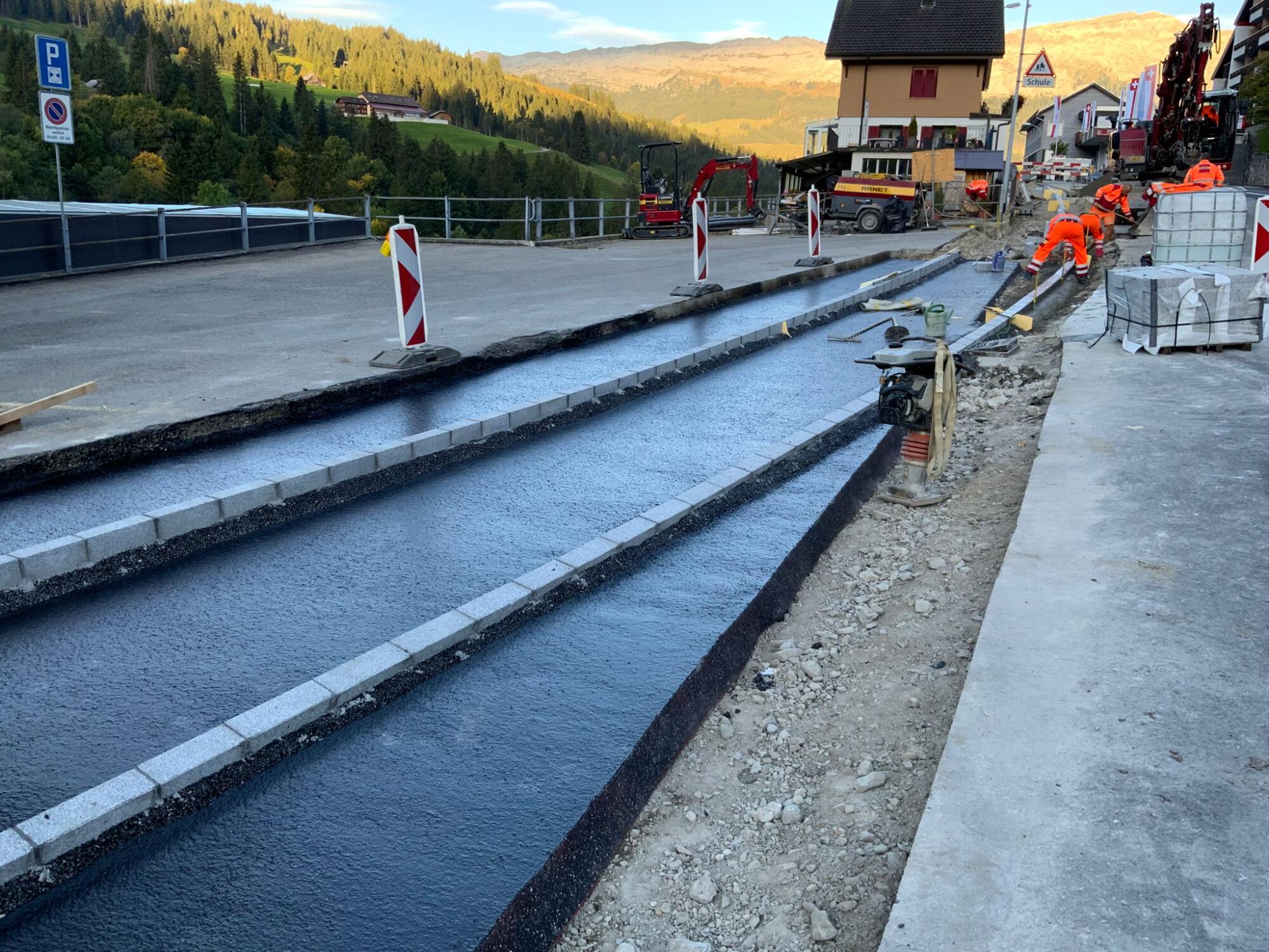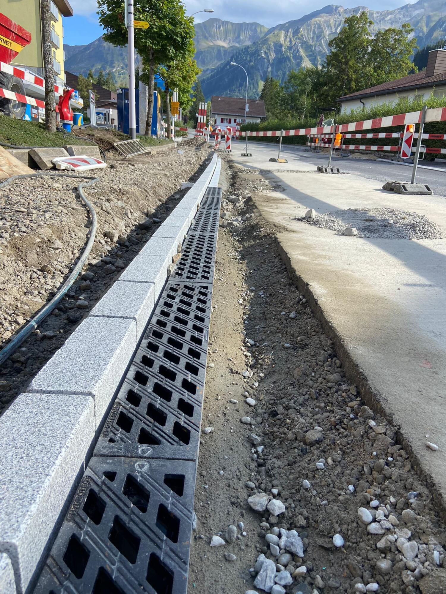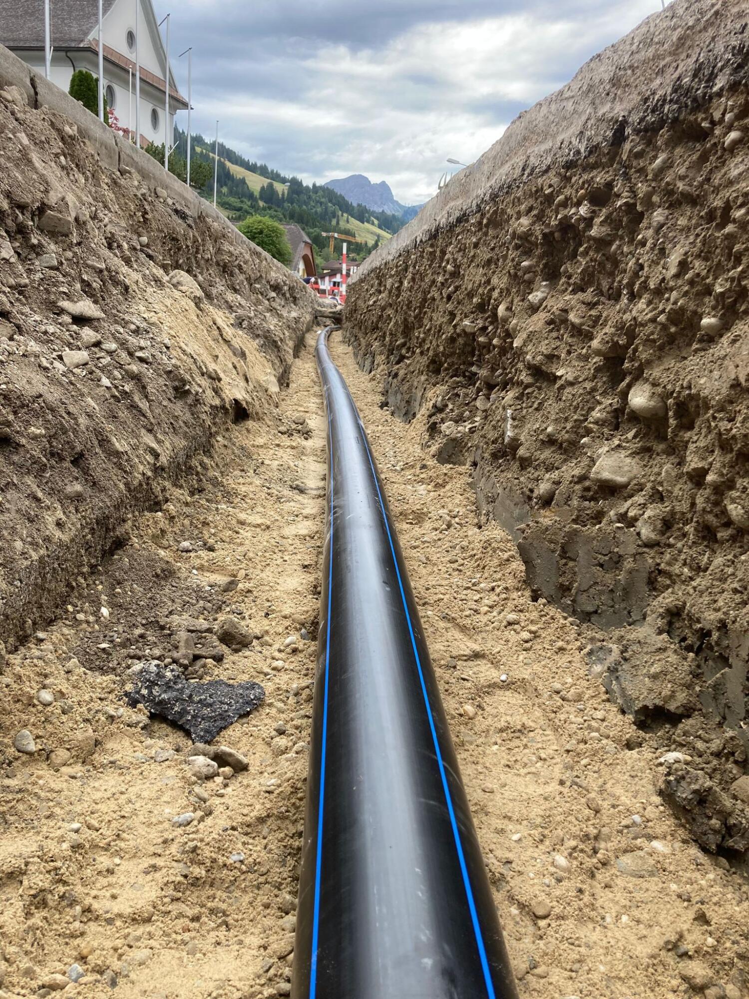 Parallel dazu realisierten wir eine neue Wasserleitung auf 600 m Länge und den Lauibachdurchlass mit rund 4 m Tiefe – sicher und termingerecht.
